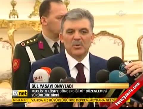 Cumhurbaşkanı Abdullah Gül, Milli İstihbarat Teşkilatı (MİT) mensupları veya bazı kamu görevlileri hakkındaki ceza soruşturmalarında başbakan izni şartını yeniden düzenleyen Devlet İstihbarat Hizmetleri ve Milli İstihbarat Teşkilatı Kanunu'nda Değişiklik Yapılmasına Dair Kanun'u onayladı.