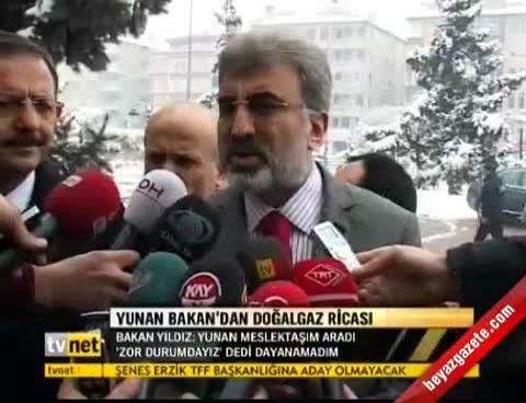 Enerji ve Tabi Kaynaklar Bakanı Taner Yıldız, '2023 Türkiye Vizyonunda Kayseri Turizmi'konulu programa katılmak üzere dün geceden Kayseri 'ye geldi. Erciyes Kayak Merkezi 'nde planlanan program yoğun kar ve tipi nedeniyle Büyükşehir Belediyesi Meclis Salonu 'na alındı. Programa katılması planlanan Kültür ve Turizm Bakanı Ertuğrul Günay da, kar engeline takıldığı için kente gelemedi. Bakan Taner Yıldız, belediyeye gelişi sırasında gazetecilerin sorularını cevapladı. Yunanistan 'a Türkiye üzerinde doğalgaz akışının sürüp sürmeyeceğinin sorulması üzerine Bakan Yıldız, Yunanlı meslektaşının aradığını ve zor durumda olduklarını söylediğini aktardı. Yıldız, 'Biz geçen hafta gerek batı hattında gerekse Azerbaycan ve İran doğalgaz hattında yaşanan sıkıntıdan dolayı Yunanistan 'da basınç düşüklüğü olmuş ve gaz veremiyorduk. Önceki gün Yunanlı meslektaşım aradı. Zorda ve sıkıntıda olduklarını söyledi. Şahsen ben dayanamadım. Aynı sıkıntıyı bizler de hissediyoruz. Herkes, her bakan sorumluluğu çerçevesinde kendi vatandaşlarına bu sıkıntıyı yansıtmak istemiyor. Biz de Ukrayna 'ya gittiğimde sağ olsun değerli meslektaşım Boykoy 'dan rica ettim. O da biraz depolarından verecek, biz de birşeyler yapacağız. Dolayısıyla dün Yunanistan 'a Yunanlı bakan arkadaşımızın ricasını kırmadık ve gaz akışını başlattık.'şeklinde konuştu.