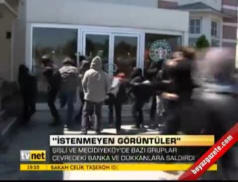 Çok sayıda iş yerinin camlarını parçalayan grup bir otelin güvenlik kameralarını da kırdı. Bankaların ATM’lerini ve bir postanenin camlarını da kıran grup Teksim istikametine ilerledi.