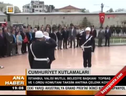 Tören öncesi Taksim Meydanı ve Atatürk Anıtı çevresi polis tarafından bariyerlerle kapatıldı. Görevliler ve siyasi parti temsilcileri dışında kimsenin alana girmesine izin verilmedi. Uygulama çevredeki bazı vatandaşlar tarafından tepkiyle karşılandı. Alana girmek isteyen bir kadın, 'Kimi kimden koruyorsunuz ' diye bağırarak polise tepki gösterdi. Tören alanına alınanlar tek tek arandı. Bu sırada CHP Beyoğlu İlçe Başkanı İnan Güney ve beraberindekiler ve arkalarında bir grup İşçi Partili çelenklerle tören alanına girmek istedi. Polis, grubun içeri girmesine izin vermedi. CHP 'liler alana girmek için ısrar edince arbede yaşandı. Grup arbede sırasında, 'Mustafa Kemalin askerleriyiz ', 'Gün gelecek devran dönecek AKP halka hesap verecek ' şeklinde slogan attı. Slogan atılırken İstanbul Valisi Hüseyin Avni Mutlu, İstanbul Büyükşehir Belediye Başkanı Kadir Topbaş ve 1. Ordu Komutanı Org. Yalçın Ataman resmi tören çerçevesinde anıta çelenk bıraktı.