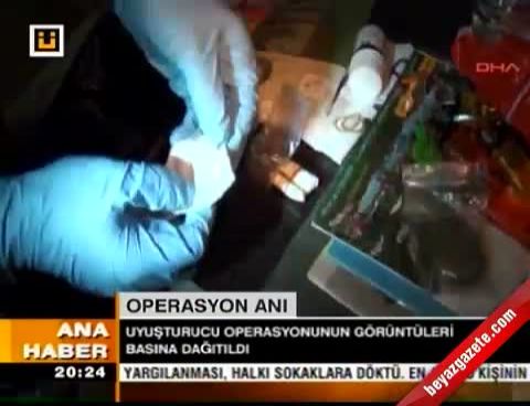 Polis kamerasınca kaydedilen görüntülerde operasyonun bütün ayrıntıları yer aldı. Bayrampaşa, Eyüp, Beyoğlu ve Şişli'deki adreslere yönelik İstanbul Narkotik Suçlarla Mücadele Şube Müdürlüğü ekiplerinin yaptığı operasyonda tiyatro sanatçısı Köksal Engür ve eşi de gözaltına alınmıştı. Operasyon kapsamında Beyoğlu'ndaki bir evde yapılan aramada, uyuşturucu haptan esrara ve nakit paraya kadar bir çok malzeme ele geçirildi. Bazı zanlıların kapıları açmaması üzerine polis, koç başı kullanarak çelik kapıları kırmak zorunda kaldı. Polisi karşısında gören zanlıların yaşadığı panik de kameraya yansıdı. Bazı şüphelilerin üzerinde esrar paketleri çıkarken, bazıları ise polis gelmeden içinde uyuşturucu bulunan kağıt parçalarını pencereden dışarı attı. Operasyonda 6 kilo 634 gram eroin, 4 kilo 951 gram esrar, 4 gram kokain, 9 adet hassas terazi, 7 ecstasy hap ele geçirildi. Uyuşturucudan kazanıldığı düşünülen 34 bin 495 TL, 11 bin 230 TL, 120 Dolar ve 100 Japon Yeni ile uyuşturucu hazırlanmasında kullanılan çok sayıda malzemeye de el konuldu. Gözaltına alınan 19 şüpheli, emniyetteki işlemlerinin tamamlanmasının ardından bu sabah adliyeye sevk edildi.
