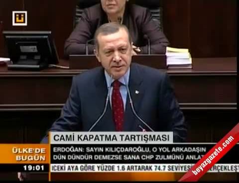Erdoğan ardından CHP 'nin o dönemdeki bu uygulamalarına ilişkin resmi belgeleri gösterdi. Başbakan ilk olarak camilerin kapatılması ve ahırlara dönüştürülmesine yönelik 19 Kasım 1935 'te çıkarılan yasayı gösterdi. Camilerin satışını mümkün hale getiren bu yasada “Cami ve mescitler kendilerinden başkaca istifade edilmek üzere kapatılır.” ifadesinin yer aldığını aktaran Erdoğan, Türkiye 'nin her vilayetinde camiler kapatılmaya başlandığını kaydetti.