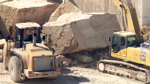 - Denizli Ballık Boğazı'nda bulunan taş ocağının drone ile çekilmiş görüntüleri - Traverten bloklarının iş makineleri yardımıyla kaynaktan ayrılması - Kaynaktan ayrılan dev taşların iş makineleriyle kamyonlara yüklenmesi - Denizli İhracatçıları Birliği Yönetim Kurulu Üyesi Ahmet Serter ile röportaj Denizli traverteni 100 ülkede boy gösteriyor - Pamukkale'yi oluşturan beyaz taş traverten, Türkiye ekonomisine de katkı sağlıyor - Denizli 'deki Ballık Boğazı mevkisindeki 40 maden ocağında yılda çıkartılan 2 milyon ton travertenin büyük bölümü yurt dışına gönderiliyor - Denizli İhracatçıları Birliği Yönetim Kurulu Üyesi Ahmet Serter:"Ballık Boğazı mevkisindeki ocaklardan çıkarılan traverten 1 milyon yaşında. Denizli traverteni dünyanın prestijli yapılarında boy gösteriyor. Özellikle Ortadoğu ve ABD'deki büyük oteller Türk ürününü tercih ediyor"DENİZLİ (AA) - YUSUF ŞAHBAZ - Türkiye'nin beyaz cenneti Pamukkale'yi oluşturan traverten, Türk turizmine katkısının yanı sıra bölgedeki taş ocaklarında yoğun mesainin ardından yer altından çıkarıldıktan sonra 100 ülkeye ihraç ediliyor.Dünya doğaltaş rezervinin yüzde 35'ine sahip Türkiye, ocak - ağustos döneminde bu sektörden 1 milyar 266 milyon dolar döviz elde etti.Türkiye'nin renkli ve kaliteli taşları dünyanın birçok ülkesi tarafından tercih edilirken, bunların arasında Denizli 'deki traverten önemli bir yer tutuyor. Türkiye'deki traverten rezervinin yüzde 50'sine sahip kentteki Ballık Boğazı'nda 40 ocak aktif olarak çalışıyor.Turizm destinasyonlarından Pamukkale'ye beyazlığını veren traverten, bölgedeki taş ocaklarından 100 ülkeye gönderiliyor. Traverten madenlerinde çalışan işçilerin mesaisi de dikkati çekiyor.12 metre uzunluğunda, 7 metre genişliğinde ve 3 metre kalınlığındaki dev traverten blokları iş makinesi yardımıyla önce kaynaktan ayrılıyor. Blok taş daha sonra lastik boyu 1,5 metreyi aşan iş makinesiyle kamyonlara yükleniyor.Fabrikaya taşınan traverten bloklar daha sonra kesilerek plaka haline getiriliyor. Cilalama ve dolgulama gibi işlemlerden geçen plakalar istenilen ebatta kesilerek satışa hazır hale getiriliyor. Kalitesine göre değişen traverten metrekaresi ortalama 35 dolara satılıyor.Bölgedeki 40 maden ocağından yılda 2 milyon ton traverten çıkarılıyor. - Traverten 1 milyon yaşında Denizli İhracatçıları Birliği Yönetim Kurulu Üyesi Ahmet Serter, AA muhabirine yaptığı açıklamada, Türkiye'nin maden ihracatının yıllık 5 milyar dolar olduğunu, bunun da 2,2 milyar dolarını doğal taşın oluşturduğunu söyledi.