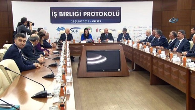 Çalışma ve Sosyal Güvenlik Bakanlığında Bakan Sarıeroğlu'nun katılımlarıyla, SGK ile Ziraat Bankası arasında "Prim Borçlarını Ödeyerek Emekli Olabilecek Tarım Bağkurlu Sigortalılara Kredi Sağlanması Protokolü" gerçekleştirildi.
