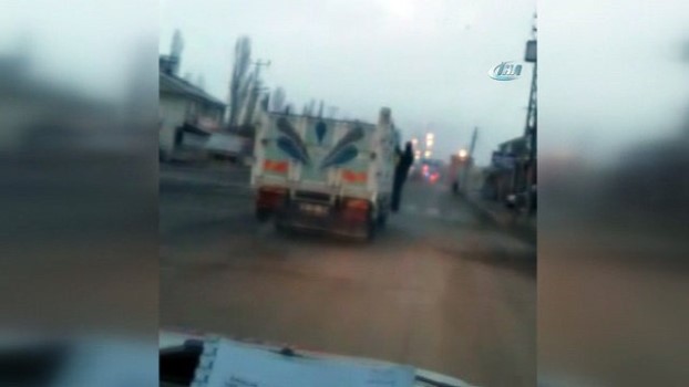 - Ağrı’da seyir halindeki bir kamyonun kasasının yan tarafına asılarak adeta ölüme davetiye çıkaran vatandaşın yaptığı yolculuk, cep telefonu kamerasına yansıdı. Ağrı - Erzurum Karayolu üzerinde bir vatandaşın cep telefonuna yansıyan görüntüler, yürekleri ağza getirdi. Yaklaşık 90 kilometre hızla giden kamyonunun kasasından asılarak yolculuk yapan bir kişi, trafikteki diğer kişilerin tepkisini çekti. Kilometrelerce yolu bu şekilde giden vatandaş, yaptığı tehlikeli yolculuğa kendisini görüntüleyenlere aldırış etmeden devam etti.