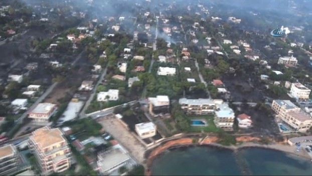 - Yunanistan’ın başkenti Atina’da en az 54 kişinin hayatını kaybetmesine yol açan orman yangını havadan görüntülendi. Yunan Savunma Bakanlığı, Yunanistan’ın başkenti Atina’nın 25 kilometre kuzeydoğusunda Mati bölgesinde kül olan orman ve evlerin havadan çekilen görüntülerini paylaştı. Ormanlık alanda başlayan ve hızla yayılan yangında en az 54 kişinin yanarak hayatını kaybetti. Bölgede evlerin yüzde 90’ı kül oldu.