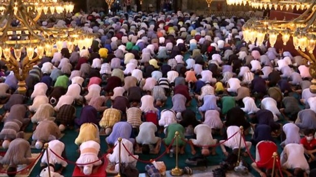 Ay, "Bu kutsal mekanın camiye dönüştürülmesinde emeği geçen başta Cumhurbaşkanımız Recep Tayyip Erdoğan ve Sayın Devlet Bahçeli'ye ve bütün devlet büyüklerimize çok teşekkür ediyorum. Çok heyecanlıyız, çok mutluyuz. Ben 2004 yılında gelmiştim buraya. Halılar yoktu o zaman, ayakkabılarımızla girmiştik. Cami mi, müze mi ikileminde kalmıştık, namazı nasıl kılacağız diye tereddüt yaşadık." diye konuştu.