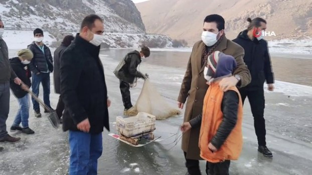 Başkan Sayan eksi 15 derecede balık tutan köylülere eşlik etti