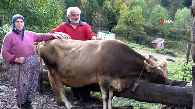 - Artvin’de Sayibe ve Nuri Öztürk çiftinin ‘Devlet’ isimli ineklerinin yaşını duyanlar hayrete düşüyor. Kendilerine 28 yıl önce hediye edilen inek sayesinde aile adeta bir çiftlik sahibi olurken, 27 kez doğum yapan ve 28.'ye gebe olan ‘Devlet’ isimli inek, evin bereketi olduğu gerekçesiyle aile tarafından satılmıyor.Artvin merkeze bağlı, Taşlıca köyünde yaşayan Sayibe (71) ve Nuri (66) Öztürk çifti, 40 yıldır hayvancılıkla uğraşıyor. Sayibe Öztürk’ün babası tarafından 28 yıl önce çifte evlilik hediyesi olarak verilen ‘Devlet’ isimli inek, ailenin adeta hayatını değiştirdi. Ortalama 10 ile 15 yıl arasında ömre sahip ineklerin aksine ‘Devlet’, 30 yaşına kadar yaşadı. Aile evin bereketi olduğuna inandığı ineklerini satmayı yada kesmeyi hiç düşünmezken, 'Devlet' isimli inek sayesinde 40 büyükbaş hayvana sahip olan aile, geçimlerini tamamen hayvancılıkla sağlıyor. Devlet’in sütünü, yoğurdunu, danasını satan aile çocuklarının okul masraflarını ve geçimlerini bu şekilde sağlamışlar.“Bütün hayvanlar bir yana 'Devlet' bir yana”"Devlet’i getirdik ahıra bereket geldi" diyen Sayibe Öztürk, ”Hayvanlarımız çoğaldı da çoğaldı. Satıyoruz yine çoğalıyorlar. Ahırda bulunan bütün hayvanlar bir tarafa o bir tarafa. Görenler şaşırıyor, 'Bu yaşta inek olur mu ? Bu hayvan ayakta nasıl duruyor?' diyorlar" derken, eşi Nuri Öztürk ise "Devlet, 30 yaşında. 27’inci danasını doğurdu, 28’e gebe. 1992 yılında paramız yok, yoksul kalmıştık. Kaynatam bu ineği danasıyla bize hediye etti. O yıldan sonra ‘Devlet’ bize 27 yıl sürekli dana doğurdu. Her sene onun danasını sattım, çocuklarımı okuttum. Çocuklara kitap aldık, defter aldık, süt sattık yoğurt sattık. Devlet gerçek anlamda bize anne baba oldu" diye konuştu.