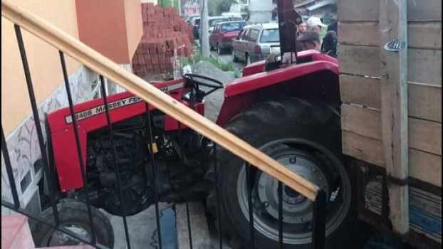 - Giresun’da freni tutmayan traktör kontrolden çıkınca eve çarparak durabildi. Edinilen bilgilere göre, Şebinkarahisar ilçesi Namık Tekin Caddesindeki evin önündeki demirleri almak isteyen Ergin Genç yönetimindeki 28 DB 041 plakalı traktör frenleri tutmayınca araçlara çarpmamak için yoldan alt seviyedeki Servet Altun’a ait evin penceresine çarparak durabildi. Meydana gelen kazada şoför Ergin Genç ve yanında ki Cevat Çakar kazayı yara alamadan atlattı. Traktörde bulunan Cevat Çakar kaza anını anlattı. Çakar, “Evin önündeki demirleri almaya traktöre yükleyecektik. Traktörün freni tutmayınca ilerideki arabalara çarpmamak için direksiyonu çevirince eve çarptık” dedi.