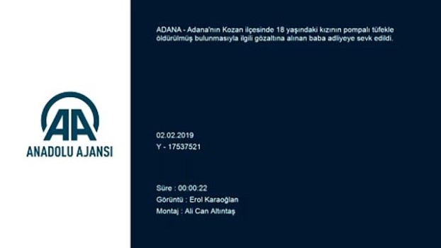 - Adana 'da genç kızın ölü bulunması - Adliye görüntüsü - Zanlının gelişi ve adliyeye çıkışı Adana 'da genç kızın ölü bulunması - Kozan ilçesinde kızının pompalı tüfekle öldürülmüş bulunmasıyla ilgili gözaltına alınan baba adliyeye sevk edildiADANA (AA) - Adana 'nın Kozan ilçesinde 18 yaşındaki kızının pompalı tüfekle öldürülmüş bulunmasıyla ilgili gözaltına alınan baba adliyeye sevk edildi.Dün Tavşantepe Mahallesi Hasan Sehlikoğlu Caddesi'ndeki evde Tuğçe T'nin (18) pompalı tüfekle öldürülmüş olarak bulunduğu sırada diğer odada baygın halde yatan baba K.T. hastanedeki tedavisinin ardından gözaltına alındı.İlaç içerek intihar girişiminde bulunduğu iddia edilen K.T'nin, emniyetteki ifadesinde kızını, erkeklerle gezdiği için öldürdüğünü öne sürdüğü öğrenildi.Şüpheli baba, emniyetteki işlemlerinin ardından adliyeye sevk edildi. - OlayKozan İlçe Emniyet Müdürlüğünü arayan bir kişi, babasının kardeşini öldürmüş olabileceği ihbarında bulunmuştu. İhbar üzerine Tavşantepe Mahallesi Hasan Sehlikoğlu Caddesi'ndeki eve giden ekipler, Tuğçe T'yi odasında pompalı tüfekle öldürülmüş bulmuştu.Diğer odada hareketsiz yatan baba K.T. ise Kozan Devlet Hastanesine kaldırılmıştı. Genç KızHastaneİntihar GirişimiPompalı Tüfek