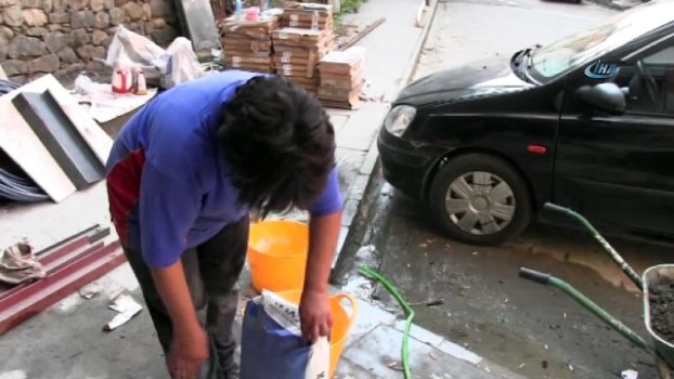 -Ayşe Usta'nın duvar delmesi ve avuçları ile harç yapması ve karıştırması