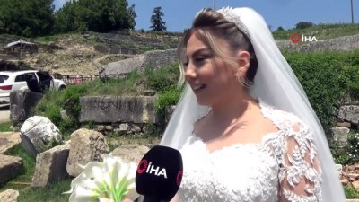 Giydiği gelinlikle antik kent kazan arkadaşlarını ziyaret etti