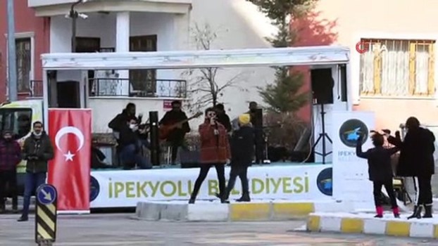 - Van’ın merkez İpekyolu Belediyesi, korona virüs nedeniyle hafta sonunu evde geçiren vatandaşların keyifli vakit geçirebilmeleri için mahalle ve sokaklarda mini konserler düzenlemeye devam ediyor. İpekyolu Belediyesine bağlı Kültür ve Sosyal İşler Müdürlüğü, hafta sonu sokağa çıkma kısıtlamaları sebebiyle evlerinde kalan ilçe sakinlerinin keyifli vakit geçirmesi için soğuk havaya rağmen müzik sistemli araçlarla cadde ve sokaklarda her hafta sonu mini konser düzenliyor. Vanlı müzisyenlerden oluşan grup, bu hafta da Halilağa Mahallesi ile Hafıziye Mahallesi Gölbaşı Caddesi’nde müzik dinletisi gerçekleştirirdi. Türkçe, Kürtçe hareketli şarkıların seslendirildiği konsere mahalle halkı da balkonlara, pencerelere çıkarak ellerine mendil alarak halaylarla, alkışlarla eşlik ederken bazı vatandaşlar da belediyenin sosyal medya hesaplarından istek parça talebinde bulundu. Müzik grubu da bu istek parçaları seslendirdi. Birçok kişi ise ellerindeki cep telefonuyla eğlenceli anları dakikalarca kaydetti.