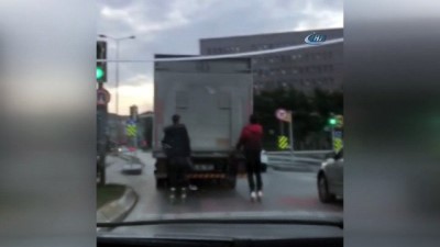 - Bakırköy ve Gaziosmanpaşa’da kamyonun arkasına tutunan gençlerin canlarını hiçe sayarak yaptıkları tehlikeli yolculuklar kameralara yansıdı Bakırköy’de trafiğin yoğun olduğu bir cadde kamyonun arkasına tutunan patenci gençler ve Gaziosmanpaşa’da kamyonun arkasına binen çocukların tehlikeli yolculukları yürekleri ağza getirdi. İstanbul’un farklı ilçelerinde patencilerin ve çocukların canlarını hiçe sayarak yaptıkları tehlikeli yolcuğu oyun gibi görmesi ise pes dedirtti. Herhangi bir olumsuzluk yaşanmadan biten tehlikeli yolculuklar ise trafikte olan diğer vatandaşlar tarafından saniye saniye cep telefonu kamerasıyla kaydedildi.