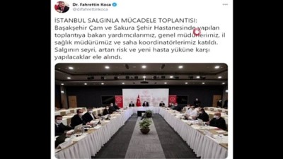 Bakan Koca, salgının seyrine ilişkin konuşulan toplantıya ait fotoğrafı ise sosyal medya hesabından paylaştı. Bakan Koca sosyal medya paylaşımında: “İstanbul Salgınla Mücadele Toplantısı: Başakşehir Çam ve Sakura Şehir Hastanesi’nde yapılan toplantıya bakan yardımcılarımız, genel müdürlerimiz, il sağlık müdürümüz ve saha koordinatörlerimiz katıldı.