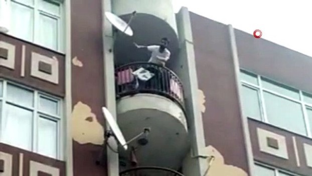 - Avcılar'da Suriyeli bir şahıs, aynı evde birlikte yaşadığı Irak uyruklu kadını dövdükten sonra balkondan atlamaya çalıştı. Olay yerine gelen polis ekipleri eve girip, bıçaklı adamı gözaltına alırken, o anlar cep telefonu kamerası tarafından kaydedildi. Olay, Avcılar Merkez Mahallesi'ndeki 5 katlı bir binanın en üst katında yaşandı. Edinilen bilgiye göre, evden kadın çığlıkları geldiğini duyan komşular, polise ihbarda bulundu. Çığlıkların yükseldiği eve gelen polis ekipleri, içeri girmek istedi ancak kapı, açılmadı. Polisin geldiğini gören Hüseyin İbrahim isimli şahıs, balkona çıkıp intihara kalkıştı. Bunun üzerine polis ekipleri, itfaiyeye haber verdi. Olay yerine gelen itfaiye ekipleri, bir yandan balkonun demir parmaklıklarında bacağını sarkan İbrahim’in atlama ihtimaline karşı hava yastığı açarken, bir yandan kapıyı açmaya başladı.