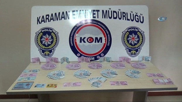 - Karaman’da polis tarafından durdurularak arama yapılan bir otomobilde, 58 bin 600 lira sahte parayla bir adet sahte çek ele geçirildi. Olayla ilgili otomobildeki 1’i yabancı uyruklu kadın olmak üzere 4 kişi gözaltına alındı. Edinilen bilgiye göre, Karaman Emniyet Müdürlüğü Kaçakçılık ve Organize Suçlarla Mücadele (KOM) Şubesi ekipleri, bazı kişilerin İstanbul'dan temin ettikleri sahte paraları Karaman’da piyasaya süreceği yönünde bilgi aldı. Bunun üzerine ekipler, takibe aldıkları şahısların içinde bulunduğu otomobili Karaman- Koya yolu üzerindeki uygulama noktasında beklemeye başladı.