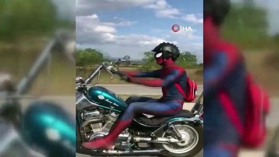 Örümcek Adam filmindeki karakteri canlandırarak eliyle ağ attı, motoru ayakta kullandı. Görenleri şaşkına çeviren sürücü Antalya istikametine doğru gitti.
