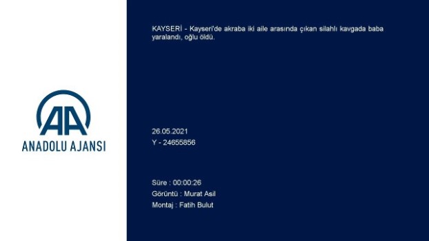 - Olay yeri - Saldırıya uğrayan ailenin yakınları - Alınan güvenlik önlemleriKAYSERİ (AA) - Kayseri 'de akraba iki aile arasında çıkan silahlı kavgada baba yaralandı, oğlu öldü.İddiaya göre, merkez Kocasinan ilçesi Buğdaylı Mahallesi 4221 Sokak'ta E.D. ve H.L.D, aralarında alacak meselesi nedeniyle husumet bulunan akraba ve komşuları İ.A'nın evine geldi.Çıkan tartışmada tabanca ile ateş açılması sonucu Y.A. olay yerinde yaşamını yitirdi, babası İ.A. yaralandı.İhbar üzerine gelen 112 Acil Servis ekipleri, İ.A'yı Erciyes Üniversitesi Tıp Fakültesi Hastanesine kaldırdı.Olayın ardından kaçan şüpheliler E.D. ve H.L.D, kısa sürede yakalandı.Olayı duyup eve gelen ailenin yakınları sinir krizi geçirdi.Polisler taşkınlık çıkaran bazı kişileri güçlükle durdurabildi.İki ailenin fertleri arasında dün akşam da kavga çıktığı ve polisin müdahalesiyle engellendiği öğrenildi. PolisSilahlı KavgaBildAkalan