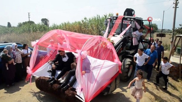 - Manisa'nın Turgutlu ilçesinde bir hafriyat firması sahibi olan 30 yaşındaki Akif Çetin iş makinesini gelin arabası yaptı. Gelin almaya hafriyat işinde kullandığı kepçe ile giden damat, gelin ile birlikte kepçenin yükleme bölümünde şehir turu attı. Turgutlu'da dünya evine giren Akif ve Nuray Çetin çiftinin gelin arabası iş makinesi oldu. Hafriyat firması sahibi damat Akif Çetin, düğününe renk katacağı düşüncesiyle hafriyat işinde kullandığı kepçeyi gelin arabası yaptı. Kepçeyi süsleyen damat çevredeki vatandaşların şaşkın bakışları arasında Atatürk Mahallesindeki kız evine giderek, gelin Nuray Çetin'i aldı. Kepçenin yükleme bölümüne oturan genç çift, alkışlar eşliğinde şehir turu attı. Düğün salonu önüne gelen konvoy, davul ve zurna ile karşılandı. Damat Akif Çetin, mesleğinin hafriyat olduğunu ve düğünlerinde farklı bir şey yapmak istedikleri için her gün kullandıkları kepçeyi gelin arabası haline getirdiklerini söyledi.