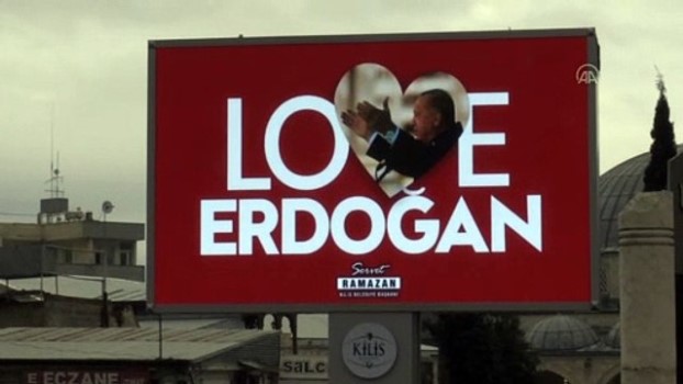 KİLİS - LED ekranlara yöresel şiveyle "Seni Çok Sevoruk Erdoğan" görseli yansıtıldı - LED ekrandan detay - LED ekrana "Seni Çok Sevoruk Erdoğan" yazısıKİLİS (AA) - ABD'nin New York kentindeki reklam panosunda yer alan "Stop Erdoğan" ifadesine cevaben, Kilis 'te LED ekranlara, yöresel şiveyle "Seni Çok Sevoruk Erdoğan" yazıldı.New York'ta "Silenced Turkey" imzasıyla yayınlanan "Stop Erdoğan" ilanına Kilis 'ten de tepki geldi.Belediye Başkanı Servet Ramazan'ın talimatıyla "Stop Erdoğan" ifadesine yanıt olarak, kentteki LED ekranlarda yöresel şiveyle "Seni Çok Sevoruk Erdoğan" görseline yer verildi. LED reklam panolarında ayrıca "Love Erdoğan" görselleri de yer aldı.