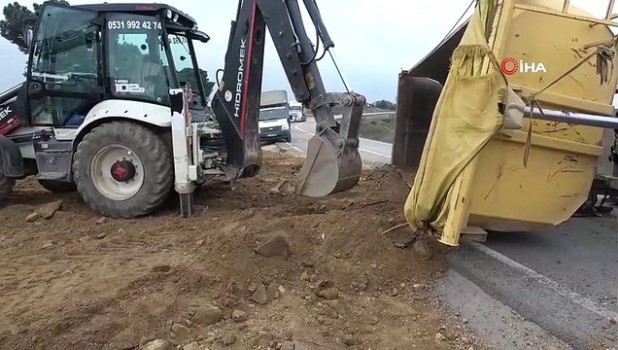 Köpeğe çarpmamak için direksiyonu kırınca hafriyat kamyonu yola devrildi