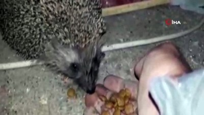 Önceleri tedirgin olduğu için uzak duran kirpi daha sonra Canerik'in elinden beslenmeye başladı.