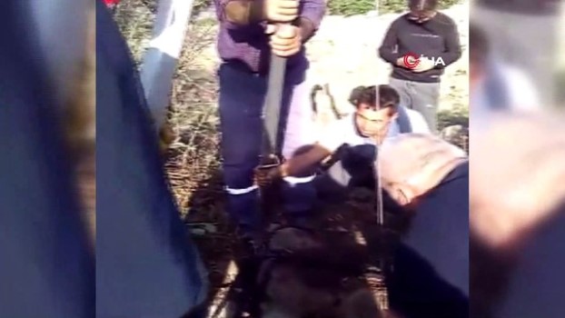 -Traktörlerle kuyudan dananın vinç ile kurtarılması