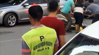 ( HATAY )- Uyuşturucu iğne atan tabancayla vurularak uyutulan angus iş makinesiyle kent merkezinden götürüldü.- Vatandaşlar bir yandan kaçarken bir yandan da cep telefonlarıyla olayı kayda aldı HATAY
