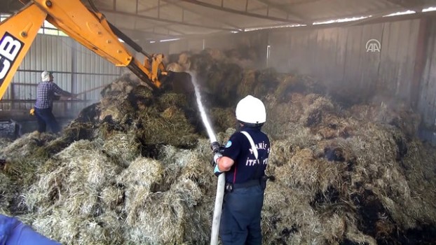 - - İtfaiye ekiplerinin yangını söndürme çalışmaları - Olay yeri detay görüntüleri - Sarıgöl ilçesinde samanlığı yanan Tunay - Sevilay Özmut çifti traktör ve tarım aletlerini kurtarmak isterken yaralandıMANİSA (AA) - Manisa ’nın Sarıgöl ilçesinde samanlık yangınında iki kişi yaralandı.Alınan bilgiye göre, Ahmetağa Mahallesi'nde Tunay ve Sevilay Özmut’a ait samanlıkta bilinmeyen nedenle yangın çıktı.Yangını farkeden Özmut ailesi hayvanları dışarı çıkartarak itfaiye ekibine haber verdi.İtfaiye ekibi gelinceye kadar alevlerin sıçradığı tarım aletlerini kurtarmaya çalışan Tunay ve Sevilay Özmut çiftinin kolları yandı.Olay yerine gelen Sarıgöl Belediyesi İtfaiye ekibi vatandaşların da yardımıyla yangını söndürdü.Yangında hayvanlar için biriktirilen yemler ile süt sağma makinesi yandı.Kolları yanan Özmut çifti hastanede tedavi altına alındı. HastaneTarımSamanlıkHayvan