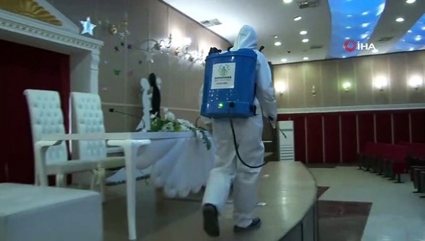 -Salonun görevliler tarafından dezenfektan edilmesinden detay