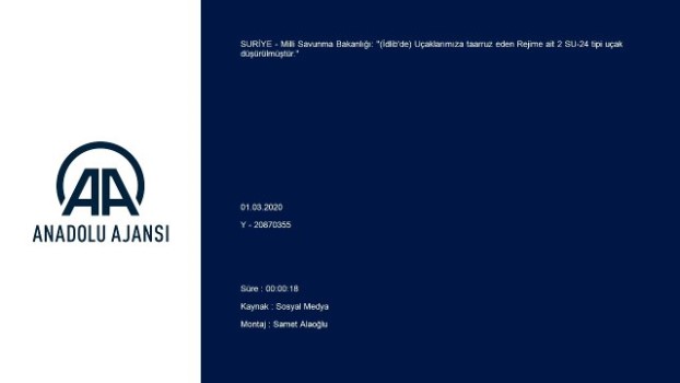 Milli Savunma Bakanlığı: '(İdlib'de) Uçaklarımıza taarruz eden Rejime ait 2 SU-24 tipi uçak düşürülmüştür.'