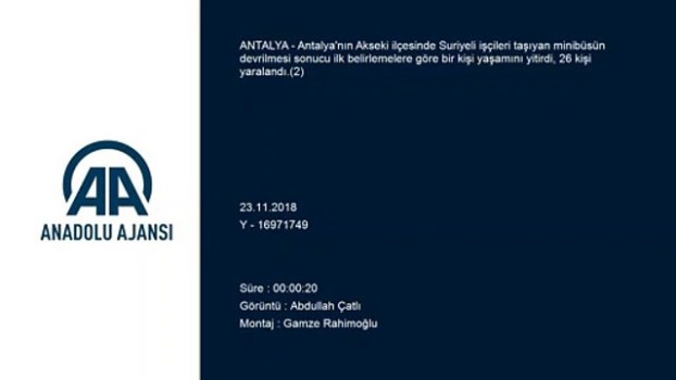 - Olay yeri Antalya 'da minibüs devrildi: 1 ölü, 26 yaralı - Akseki - Manavgat kara yolunda Suriyeli işçileri taşıyan minibüsün devrilmesi sonucu ilk belirlemelere göre bir kişi öldü, yaralanan 26 kişi hastanelere kaldırıldıANTALYA (AA) - Antalya 'nın Akseki ilçesinde Suriyeli işçileri taşıyan minibüsün devrilmesi sonucu ilk belirlemelere göre bir kişi yaşamını yitirdi, 26 kişi yaralandı.Şanlıurfa'dan Antalya 'ya Suriyeli işçileri taşıyan 63 F 3240 plakalı minibüs, Akseki - Manavgat kara yolu Güçlüköy mevkisinde devrildi.Kazada ilk belirlemelere göre, bir kişi hayatını kaybetti, 26 kişi yaralandı.Yaralılar, çevredeki hastanelere kaldırıldı. Hastane