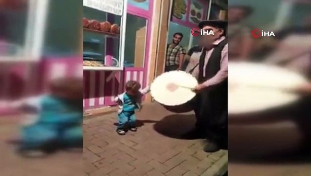 Bir eliyle davulu tutan minik çocuk kalabalığın şaşkın gözleri ününde oynamaya başladı.