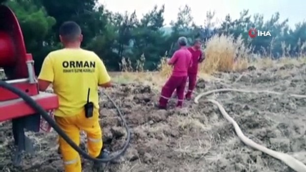 --Yangın söndürme ekibinden bir kişi yanan yere hortumla su sıkıyor