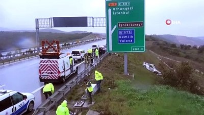 - Gebze-Orhangazi-İzmir Karayolu Karsak kavşağı yakınlarında meydana gelen trafik kazasında lüks bir otomobil kontrolden çıkarak bariyerlere çarpıp şarampole yuvarlandı. Yabancı plakalı aracın sürücüsü araç içinde feci şekilde can verdi. Kaza saat 11.30 sıralarında Gebze-Orhangazi-İzmir Otoyolu, Gemlik Karsak Kavşağı yakınlarında meydana geldi. Edinilen bilgiye göre, Mert Ökmen (48) idaresindeki YE67-GXO yabancı plakalı bir otomobil Bursa istikametinden İstanbul istikametine doğru seyir halindeyken aşırı hız ve yolun yağıştan dolayı kaygan olmasından dolayı kontrolden çıktı. Bariyerle çarpan, yol kenarındaki otoyol firmasına ait kontrol kutularını parçalayıp şarampole uçan otomobil hurdaya döndü. Sürücü olay yerinde can verdi Kazayı gören diğer sürücülerin ihbarı üzerine olay yerine sağlık ekipleri, itfaiye ve AFAD ekipleri sevkedildi. Olay yerine gelen sağlık ekipleri direksiyonu sağda olan otomobilin sürücüsü Mert Ökmen’in hayatını kaybettiğini tespit etti. Kaza yeri savaş alanına dönerken, Cumhuriyet Savcısı’nın olay yerinde yaptığı incelemenin ardından sürücü Mert Ökmen’in cesedi araç içinden çıkarıldı. Yağmur nedeniyle güçlükle sürdürülen kurtarma çalışmaları sonrasında Mert Ökmen’in cenazesi cenaze aracına konarak Gemlik Devlet Hastanesi morguna kaldırıldı. Kazada hurdaya dönen otomobil ise vinç yardımı ile şarampolden çıkarılarak çekiciye kondu. Polis ekipleri kaza ile ilgili soruşturma başlattı. (MÖ-