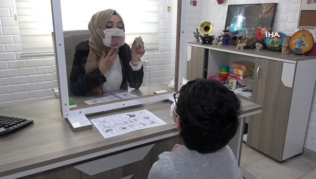 Bu kapsamda Uşak'ta özel bir özel eğitim ve rehabilitasyon merkezinde çalışan eğitmen Sümeyye Günay (25) konuşma güçlüğü çeken öğrencileri için geliştirdiği şeffaf maske tekniğiyle eğitimlerini sürdürüyor. Steril bir maskenin ağız kısmına şeffaf bir asetat yerleştirerek yaptığı maskeyle görenlerin ilgisini çeken Günay, tekniğinin ağız okuma açısından önemli olduğunu dile getirdi. Aynı maskeden öğrencilerine de yapan Günay, tekniğinin oldukça faydalı olduğunu kaydetti.