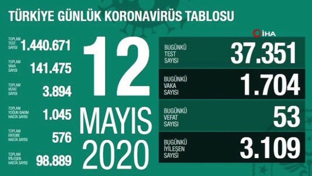 ( ANKARA ) . Bugün toplam 37 bin 351 test yapılırken, bin 704 yeni vaka tanısı konuldu, 3 bin 109 kişi iyileşti.