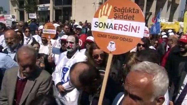 İzmir’in Bornova ilçesinde Aile Sağlığı Merkezinde görevli Dr. Nuri Ersoy Yoğurtçu, 29 Mart’ta hasta kocası için ilaç yazdırmak isteyen B.K. adlı kadının bu teklifini kabul etmemesi üzerinde daha sonra hasta M.Y. ve beraberindekiler tarafından darp edilmişti. Hem bu olay hem de sağlıkta artan şiddet olaylarına tepki, İzmir Sağlık Platformu bileşenlerinden geldi. Konak’ta bir araya gelen onlarca sağlık çalışanı, ellerindeki dövizlerle “Sağlıkta şiddet son bulsun”, “Şiddet varsa hizmet yok” sloganları attı. Darp edilen doktor Nuri Ersoy Yoğurtçu’nun da yer aldığı eylemde bazı sağlık çalışanları, temsili olarak başlarındaki sargı bezleri ile hazır bulundu. “Adım atılmadığını üzülerek görüyoruz” İzmir’de birinci basamak sağlık hizmeti veren kuruluşların bir gün süre ile iş bırakmaya çağrıldığı eylemde konuşan İzmir Aile Hekimleri Derneği Başkanı Birol Kocaman, “Biz hekimler ve sağlık çalışanları, bu koşullar altında görevimizi yerine getiremiyoruz. Yetkililerden bir an önce sağlıkta şiddeti önleyici, yaptırım gücü yüksek yasal değişiklik istiyoruz. İzmir Sağlık Platformu olarak sağlıktaki şiddete kamuoyunun ve kamu otoritesinin dikkatini çekmek üzere birinci basamakta bir günlük iş bırakma çağrısı yaptık. Sağlıkta şiddet sadece birinci basamakta değil, sağlık hizmetinin verildiği tüm alanlarda; acil servislerde, kamu ve özel hastanelerde, yoğun bakımda önemli bir sorun olmaya devam etmektedir. Çabalarımıza karşın nice şiddet olayıyla ilgili siyasi iktidarın hiçbir adım atmadığını üzülerek görüyoruz” dedi.
