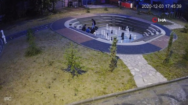 Kuru havuz, oturma grupları, yön yıldızı ve kameriyelerinde bulunduğu alandaki oyun alanına zarar veren şahısları tespit etmek üzere güvenlik kameraları incelendi. Yapılan incelemelerde vatandaşların yoğun ilgisiyle karşılanan oyun alanına 4 kişilik bir gurubun girdiği görülüyor. İçlerinden bazıları tribünlerde otururken diğerleri oyun alanı içindeki satranç taşlarını ayakları ile itip üst üste dizmeye çalışıyor. Üst üste koydukları taşların üzerine diğer taşları fırlatarak düşürmeye çalışan kişiler ardından da taşları tekmeliyor. Mukavim malzemeden yapıldıkları için taşlara herhangi bir zarar veremeyen gençler, daha sonra hiçbir şey yapmamış gibi olay yerinden ayrılıyor. O anlar ise saniye saniye güvenlik kamerasına yansıdı. Görüntüleri kamuoyu ile paylaşan yetkililer yaşanılanlara tepki gösterdi. (GÇ-