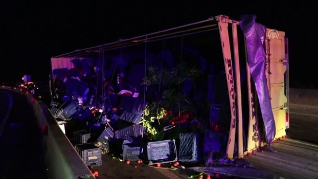 - Fethiye - Muğla kara yolunda devrilen sebze yüklü kamyon - Kamyondan yola saçılan sebzelerin iş makinesiyle kaldırılması - Vatandaşların sebzeleri toplaması Muğla 'da sebze yüklü kamyon devrildi: 3 yaralıMUĞLA (AA) - Muğla 'nın Fethiye ilçesinde, sebze yüklü kamyonun devrilmesi sonucu 3 kişi yaralandı.Hakan Akbaş idaresindeki 45 M 8213 plakalı sebze yüklü kamyon, Fethiye - Muğla kara yolu Katrancı mevkisinde henüz belirlenemeyen bir nedenle devrildi.Kamyon yaklaşık 100 metre sürüklendikten sonra durabildi. Kazayı görenlerin durumu bildirmesi üzerine olay yerine itfaiye, polis ve sağlık ekipleri gönderildi.Kazada Akbaş ile kamyonda bulunan Hakim Çiçek ve Ramazan Yıldız yaralandı. Fethiye Devlet Hastanesi'nde tedavi altına alınan yaralıların hayati tehlikesinin bulunmadığı öğrenildi.Kazanın ardından kara yoluna saçılan sebzeler nedeniyle ulaşım, trafik polisleri tarafından kontrollü olarak sağlandı.İş makineleri ve vatandaşlar tarafından yoldaki sebzelerin toplanmasının ardından ulaşım normale döndü. Sebze Yüklü KamyonPolisİş MakinesiSağlık EkipleriTrol