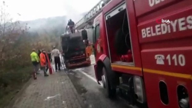 - Bartın’ın Ulus ilçesinde seyir halindeki tır alev aldı. Alev alan tıra Ulus Belediyesi İtfaiye ekiplerince müdahale edildi. Mehmet Bakırcı yönetimindeki 37 RD 757 plakalı Scaina marka mermer yüklü tır Ulus ilçesi yakınlarında alev aldı. Pınarbaşı mevkiinden Ulus istikametine seyir halindeki tırdan dumanların ve alevlerin yükselmeye başladığını gören sürücü aracı durdurarak durumu itfaiye ekiplerine bildirdi. Ulus Belediyesine bağlı itfaiye ekiplerince müdahale edilen yangın kısa sürede kontrol altına alındı. İtfaiye ekiplerinin erken müdahalesi ile tırın tamamen yanması engellendi. Tırın kupa kısmı olarak tabir edilen şoför mahallinde büyük hasar oluştuğu görüldü.
