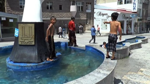 - Erzurum’da sıcaktan bunalan çocuklar, yasak ve tehlikeli olmasına aldırış etmeden parklardaki süs havuzlarına girerek serinlemeye çalışıyor. Hava sıcaklığının 27 dereceyi gösterdiği Erzurum’da sıcaktan bunalan çocuklar Taş Mağazalar caddesinde bulunan süs havuzunda serinliyor. Havuza giren ve etrafında güneşlenen çocuklar, fıskiye altında oyunlar oynayarak serinlemeye çalışıyor. Elbiseleriyle süs havuzunda serinleyen çocuklar, daha sonra çimlerin üzerine uzanarak kurulanıyor.