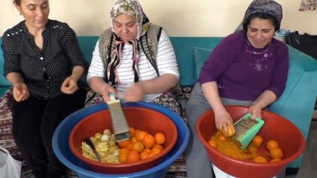 -Dernekte bayanların turunçları reçel yapmaya hazır hale getirmesinden detay