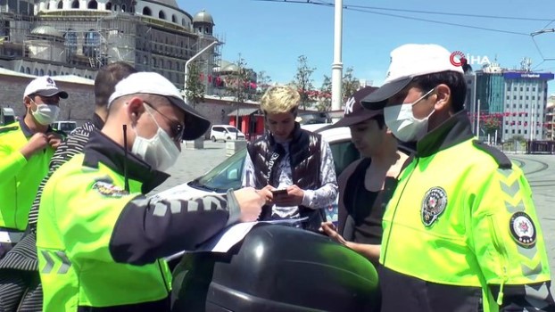 - Taksim Meydan’da sokağa çıkma kısıtlamasına uymayan ve maskesiz gezen 3 şahısa toplam 9 bin 450 lira para cezası kesildi. Ceza kesilen şahıslardan biri, “Bana ceza işlemez ama siz yine de cezanızı yazın” ifadelerini kullandı. Korona virüsle (Covid-19) mücadele kapsamında alınan sokağa çıkma kısıtlaması kararına ilişkin denetimler yapılmaya devam ediyor. Taksim Meydan’da kurallara uymayan ve maskesiz sokağa çıkan 3 şahısa toplam 9 bin 450 lira ceza kesildi. Ceza kesilen şahıslardan biri, “Bana ceza işlemez ama siz yine de cezanızı yazın” ifadelerini kullandı. Polis memuruyla tartışan şahıs, ters kelepçe yapılarak Taksim Polis Merkezine götürüldü. Kelepçelenen şahısın üzerinde kimlik ve pasaport çıkmadı.