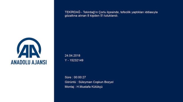 : - Zanlıların adliyeye getirilmesi Tekirdağ 'daki tefecilere yönelik operasyon - Çorlu ilçesindeki operasyonda tefecilik yaptıkları iddiasıyla gözaltına alınan 8 zanlıdan 5'i tutuklandıTEKİRDAĞ (AA) - Tekirdağ 'ın Çorlu ilçesinde, tefecilik yaptıkları iddiasıyla gözaltına alınan 8 kişiden 5'i tutuklandı.Alınan bilgiye göre, Çorlu Cumhuriyet Savcılığı tarafından yürütülen soruşturma kapsamında Tekirdağ Emniyet Müdürlüğü Kaçakçılık ve Organize Suçlarla Şube Müdürlüğü ile Çorlu Emniyet Müdürlüğü ekiplerince düzenlenen operasyonda gözaltına alınan U.U, M.A, R.T, B.C , K.A, Y.A, Y.U. ve F.K'nin emniyetteki işlemleri tamamlandı.Mahkemeye çıkarılan zanlılardan U.U, M.A, R.T, B.C ve K.A tutuklanırken, Y.A, Y.U ile F.K adli kontrol şartıyla serbest bırakılmıştı. - OlayÇorlu Cumhuriyet Savcılığı tarafından yürütülen soruşturma kapsamında ilçede "tefecilik" ve "nitelikli yağma" suçu işledikleri tespit edilen 11 kişinin yakalanmasına yönelik çalışma başlatılmış, Tekirdağ Emniyet Müdürlüğü Kaçakçılık ve Organize Suçlarla Şube Müdürlüğü ile Çorlu Emniyet Müdürlüğü ekiplerince düzenlenen operasyonda da 8 kişi gözaltına alınmıştı.Operasyon düzenlenen adreslerde yapılan aramalarda, kişilere tefecilikle verilen paraların not edildiği defter, 84 boş senet koçanı, farklı kişilere ait farklı vade ve miktarlarda 20 senet, banka kartları ve dekontları ele geçirilmişti.