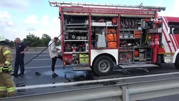 ( İSTANBUL -ÖZEL)- Ayağı yanan sürücüye itfaiyeden sulu müdahale- Sürücü canını güçlükle kurtardı- Otoyolda uzun araç kuyrukları oluştu İSTANBUL