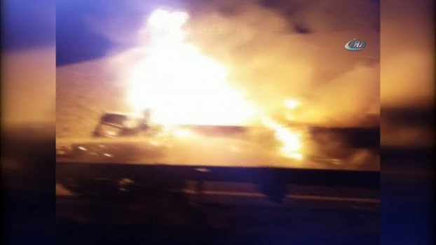 - Niğde’de kamyona arkadan çarpan bal mumu yüklü tır alev alev yandı. Yangın nedeniyle otoyol 1,5 saat kapalı kaldı. Gece saatlerinde Niğde- Adana otoyolu Basmakçı mevkiinde meydana geldi. iddiaya göre Servet Ü. yönetimindeki (31) 33 KNB 42 plakalı tır, Hakan G’nin (21) kullandığı 63 EY 341 plakalı karpuz yüklü kamyona arkadan çarptı. Çarpmanın etkisiyle tır yanmaya başladı.