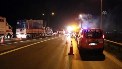 - Yanan tır ve soğutma çalışmalarından görüntülerKOCAELİ (AA) - Kocaeli 'nin Körfez ilçesinde karton yüklü tırda çıkan yangın, itfaiye ekiplerince söndürüldü.Alınan bilgiye göre, Anadolu Otoyolu'nun Ankara istikameti Körfez gişeler mevkisinde, 81 EB 649 plakalı karton yüklü tırın dorsesinde, henüz belirlenemeyen nedenle yangın çıktı.Yangını fark eden tır sürücüsü Ramazan Sabır, aracı emniyet şeridine çekerek durumu itfaiyeye bildirdi.İhbar üzerine olay yerine gelen itfaiye ekipleri, yangını kısa sürede söndürürken, tırın dorsesinde hasar meydana geldi.Yangın nedeniyle bir süre trafiğe kapanan yol, kontrollü olarak ulaşıma açıldı. BildEmniyet ŞeridiTrol